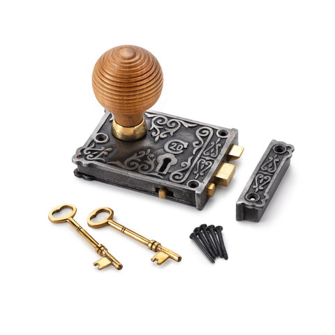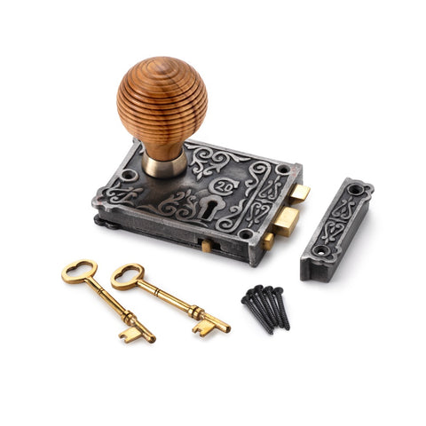Cast Iron Floral Rim Lock Teak Aged Brass Beehive Door Knobs