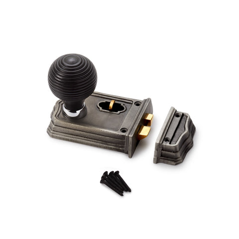 Large Victorian Gothic Rim Lock Ebony Aged Brass Bun Door Knobs