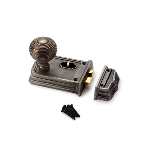 Small Victorian Gothic Rim Lock Hollow Aged Bronze Beehive Door Knobs