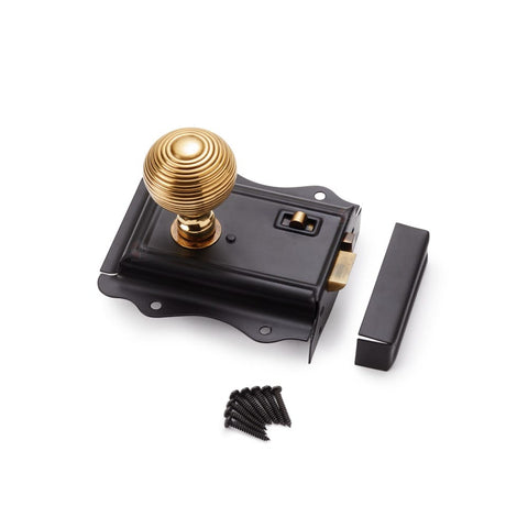 Black Brass Flanged Rim Lock Ebonised Polished Chrome Beehive Door Knobs