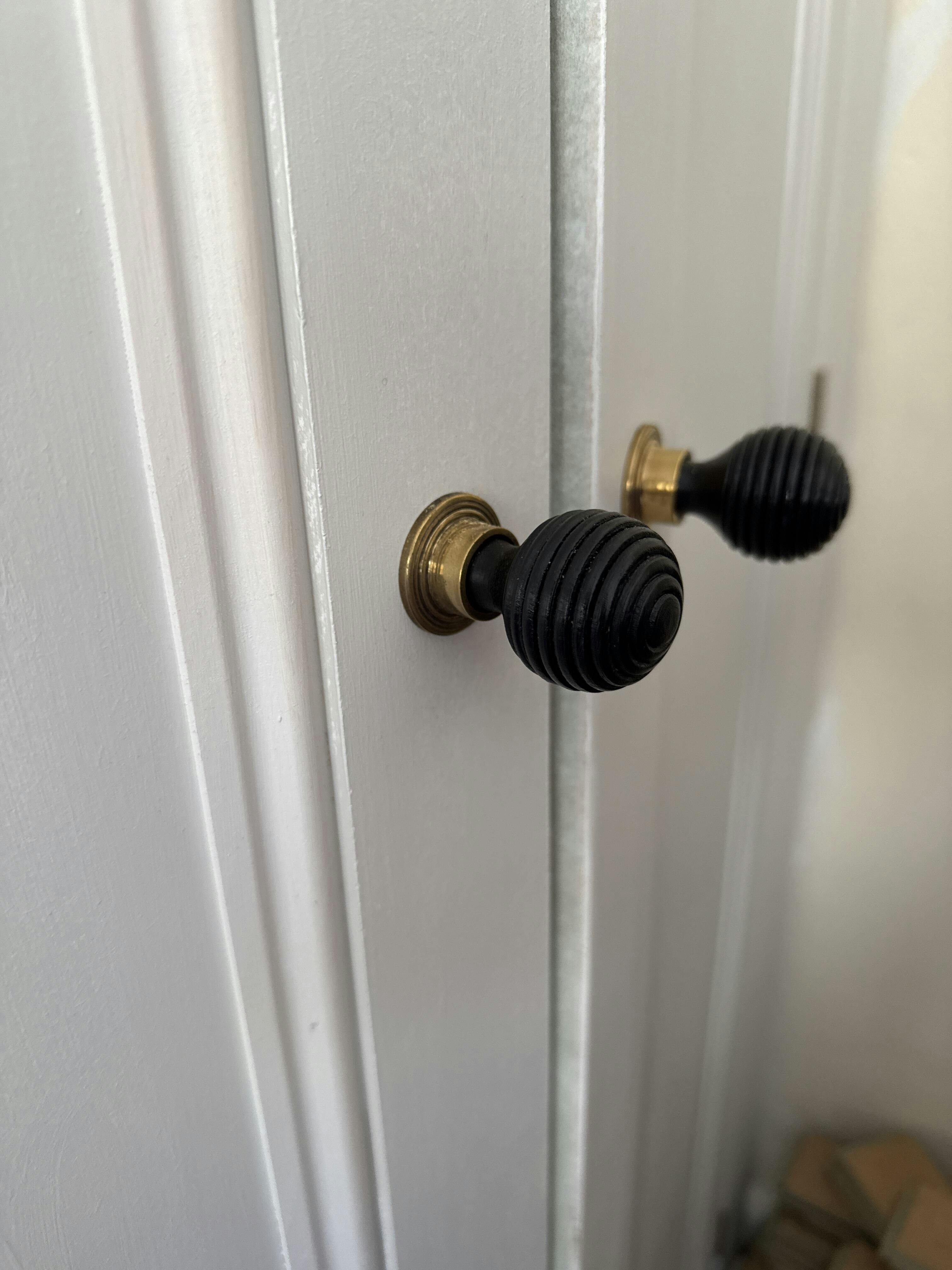 Enhance your cabinetry with our beautifully designed black ebonised wooden beehive cupboard knobs complete with an aged brass backplate. Each knob is complete with a fixing bolt.