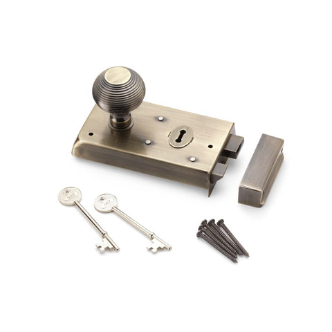 This Antique Brass Narrow Rim Lock with matching Heavy Antique Brass Beehive Door Knobs brings a timeless, traditional look to any home. Crafted for both style and practicality, this set offers secure, smooth operation and a classic antique brass finish that complements period, cottage-style, and rustic interiors.